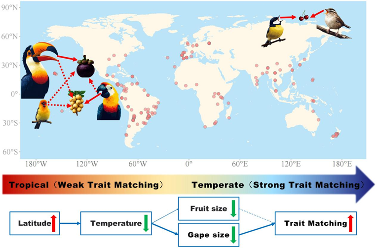 日前,半岛在线体育网生命科学学院易现峰教授团队在协同进化与适应性研究领域取得了重要突破,相关研究成果以“Global avian frugivore-fruit trait matching decreases towards the tropics”为题发表于国际顶级期刊《Global Change Biology》(原文链接:https://onlinelibrary.wiley.com/doi/10.1111/gcb.70180),这是曲阜师大首次作为第一通讯作者单位在该期刊上发表研究成果。《Global Change Biology》由Wiley-Blackwell Publishing Ltd出版,为生态环境领域具有广泛影响力的顶级期刊,专注于报道全球变化相关的创新性研究成果,最新影响因子(IF)为10.8,五年平均影响因子为13,被SCI数据库收录(中科院大类和小类双一区Top)。