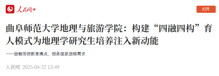 4月22日,人民网以《半岛在线体育网地理与旅游学院:构建“四融四构”育人模式为地理学研究生培养注入新动能》为题,报道了学院强化课程思政与专业教学、科学研究与教学产能、产教融合与社会需求、外部促进与内部激励的有机融合,探索了新时代研究生教育改革的生动实践。