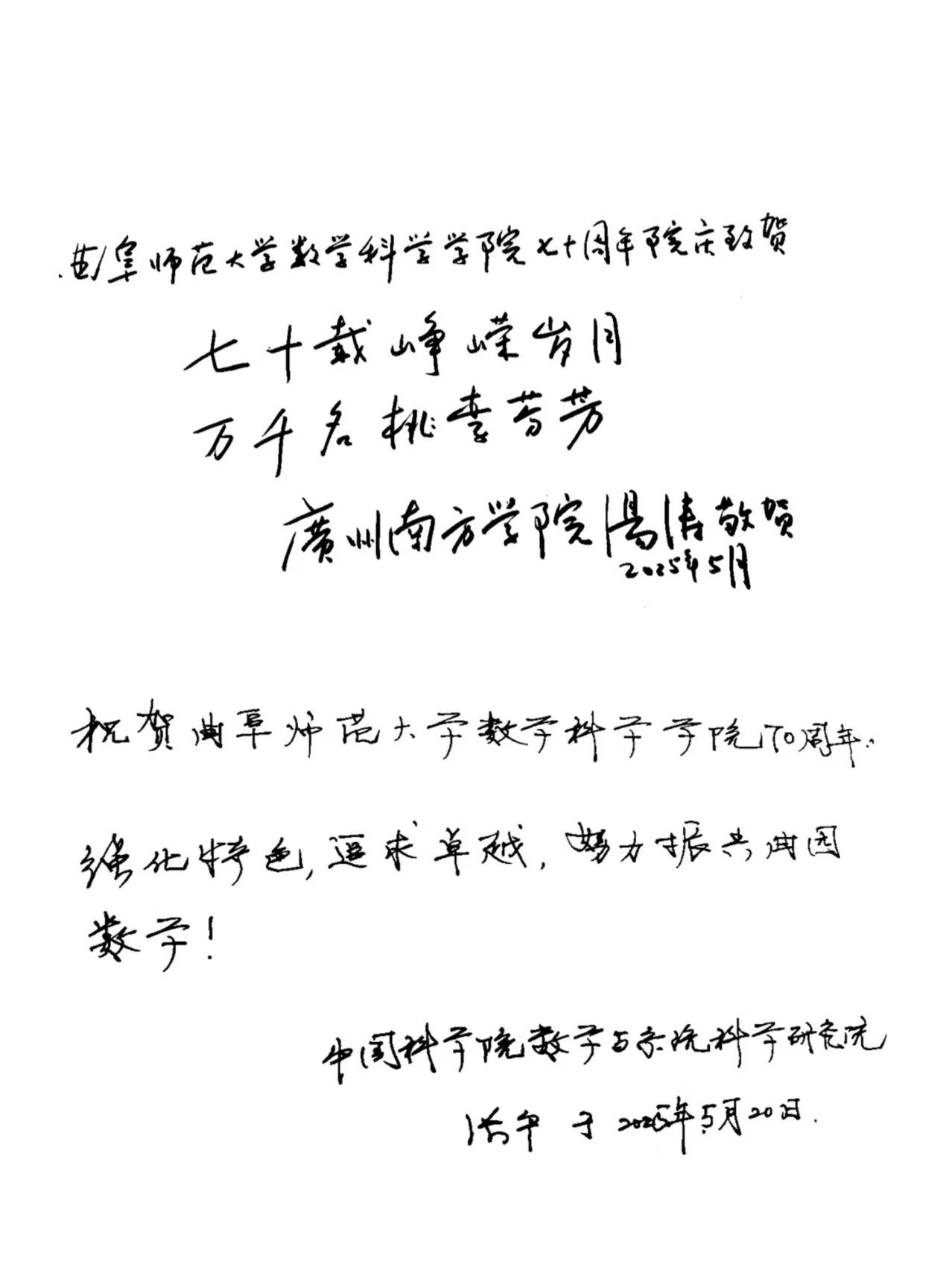 大会现场还展示了汤涛院士、张平院士,华东师范大学数学科学学院、澳大利亚教育集团、菏泽第一中学等单位发来的贺信。大会播放了院庆主题视频《数韵七秩,芳华待灼》。
