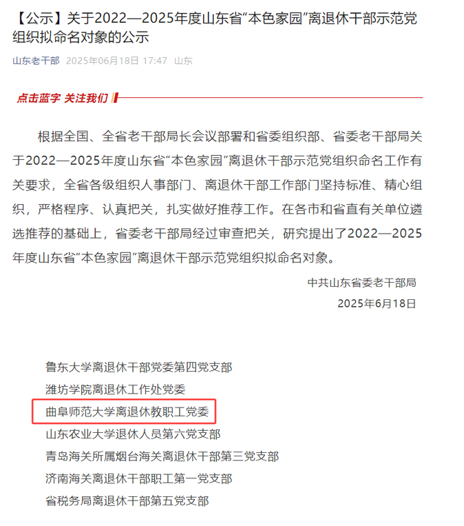曲阜师大离退休教职工党委获评山东省“本色家园”离退休干部示范党组织
