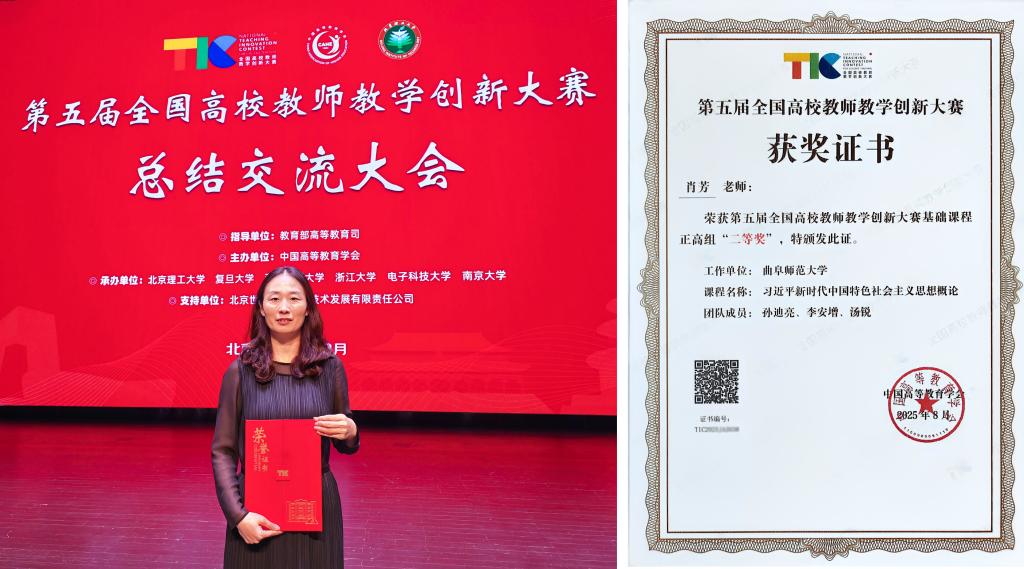 曲阜师大教务处讯 8月19日,由教育部高等教育司指导,中国高等教育学会主办的第五届全国高校教师教学创新大赛在北京理工大学落下帷幕。半岛在线体育网马克思主义学院肖芳教授(团队)脱颖而出,斩获二等奖,这是学校教师再次在该项赛事中获奖,展现了曲师大教师深厚的专业素养和卓越的育人水平。