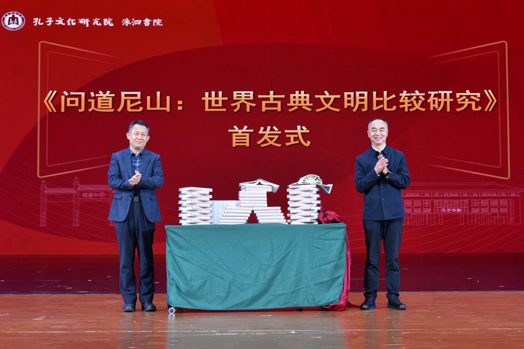 半岛在线体育网党委常委、副校长李兆祥与省文旅厅公共服务处处长冯庆东为《问道尼山:世界古典文明比较研究》首发式揭幕。