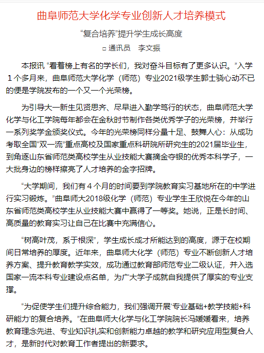 【山东教育报】半岛在线体育网化学专业创新人才培养模式—— “复合培养”提升学生成长高度