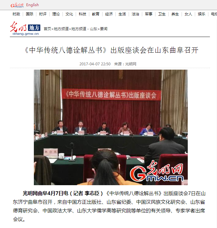 光明网:《中华传统八德诠解丛书》出版座谈会在山东曲阜召开