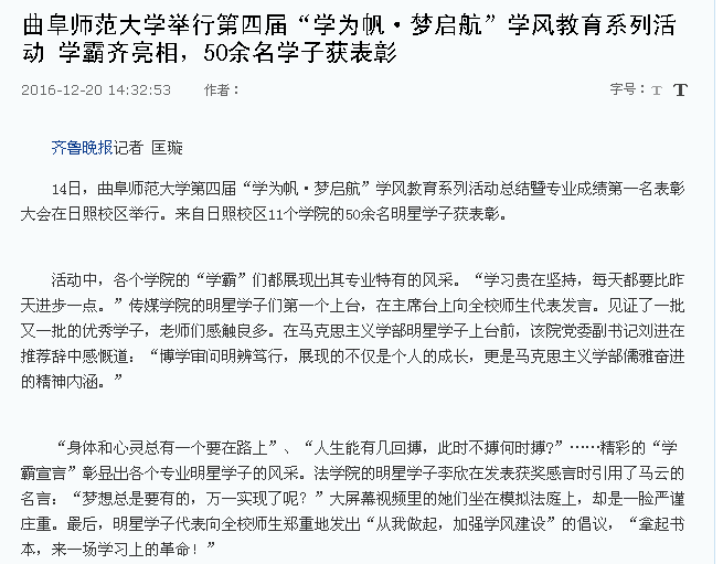 齐鲁晚报:半岛在线体育网举行第四届“学为帆·梦启航”学风教育系列活动 学霸齐亮相,50余名学子获表彰