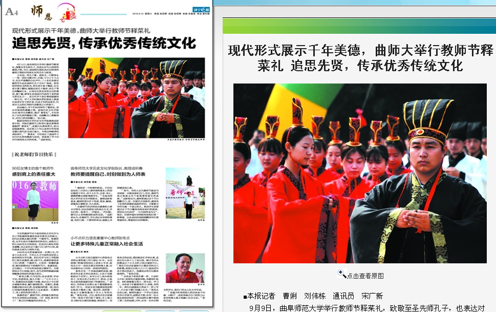济宁晚报《曲师大释菜礼追思先贤 传承优秀传统文化》:http://epaper.jn001.com/jnwb/html/2016-09/10/content_175474.htm