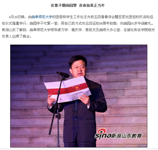 新浪网报道链接:曲师大举行五四青春诗会 百家社团迎曲园60年校庆