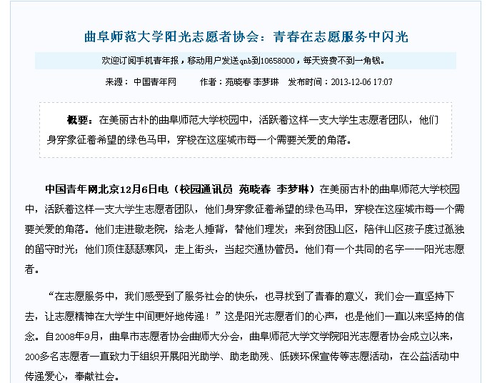 中国青年网:半岛在线体育网阳光志愿者协会:青春在志愿服务中闪光