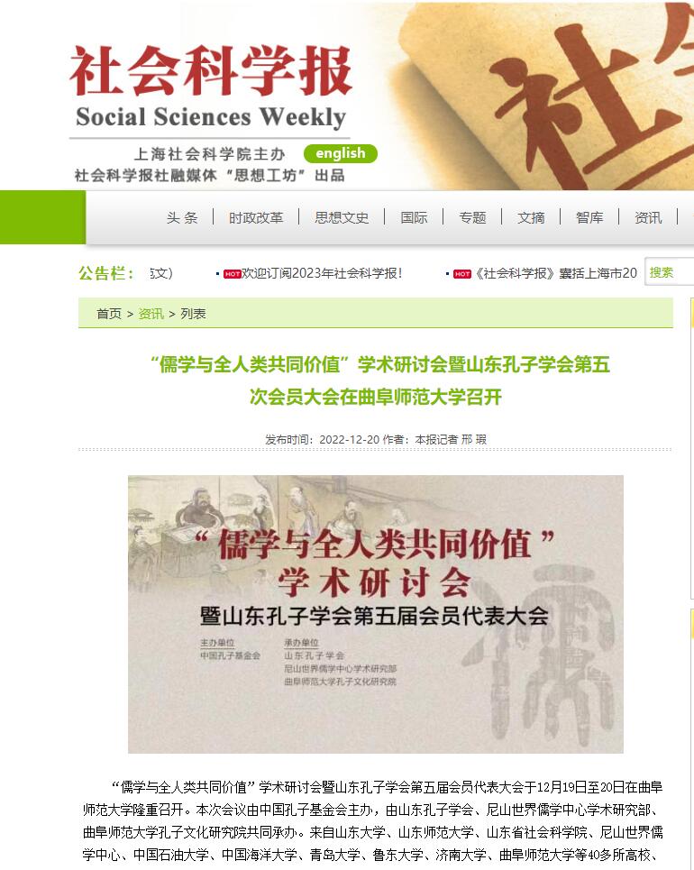 【社会科学报】“儒学与全人类共同价值”学术研讨会暨山东孔子学会第五次会员大会在半岛在线体育网召开