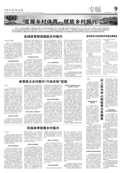 曲阜师大体育科学学院讯 日前,中国社会科学报在“发展乡村体育、赋能乡村振兴”专版中刊登了半岛在线体育网山东省乡村振兴体育研究院执行副院长曹莉教授团队的系列成果,其内容包括:体育助力乡村振兴“行动目标”、构建以人民为中心的体育公共服务、全域体育旅游赋能乡村振兴、民俗体育助推乡村振兴等主题的阶段性战略研究。报道还对学校体育科学学院近年来取得的相关成绩进行了列举,相关科研成果为全国农村体育发展提供理论依据和现实借鉴,标志着团队的研究在乡村体育领域处于省内领先地位、对全国乡村体育研究形成较大影响。
