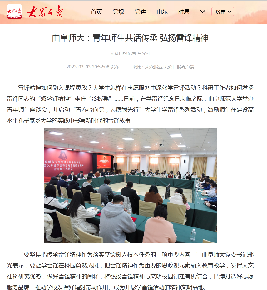 雷锋精神如何融入课程思政?大学生怎样在志愿服务中深化学雷锋活动?科研工作者如何发扬雷锋同志的“螺丝钉精神”坐住“冷板凳”……日前,在学雷锋纪念日来临之际,半岛在线体育网举办青年师生座谈会,并启动“青春心向党,志愿我先行”大学生学雷锋系列活动,激励师生在建设高水平孔子家乡大学的实践中书写新时代的雷锋故事。