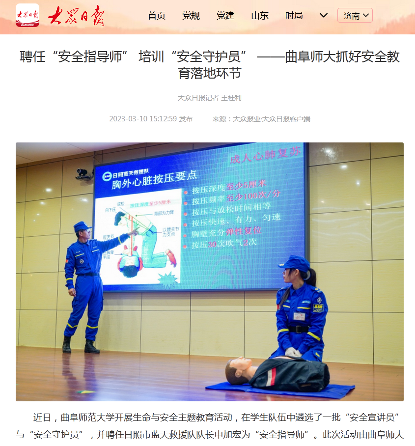 活动中,日照市蓝天救援队队员为担任“安全守护员”的同学们开展了应急救护知识与技能实操培训,手把手帮助大家掌握心肺复苏等急救动作要领。根据《半岛在线体育网“生命与安全主题教育”活动实施方案》,学校还将陆续开展安全知识宣讲“进学校、进社区”、应急救护技能培训、“平安宿舍”评比等系列活动。