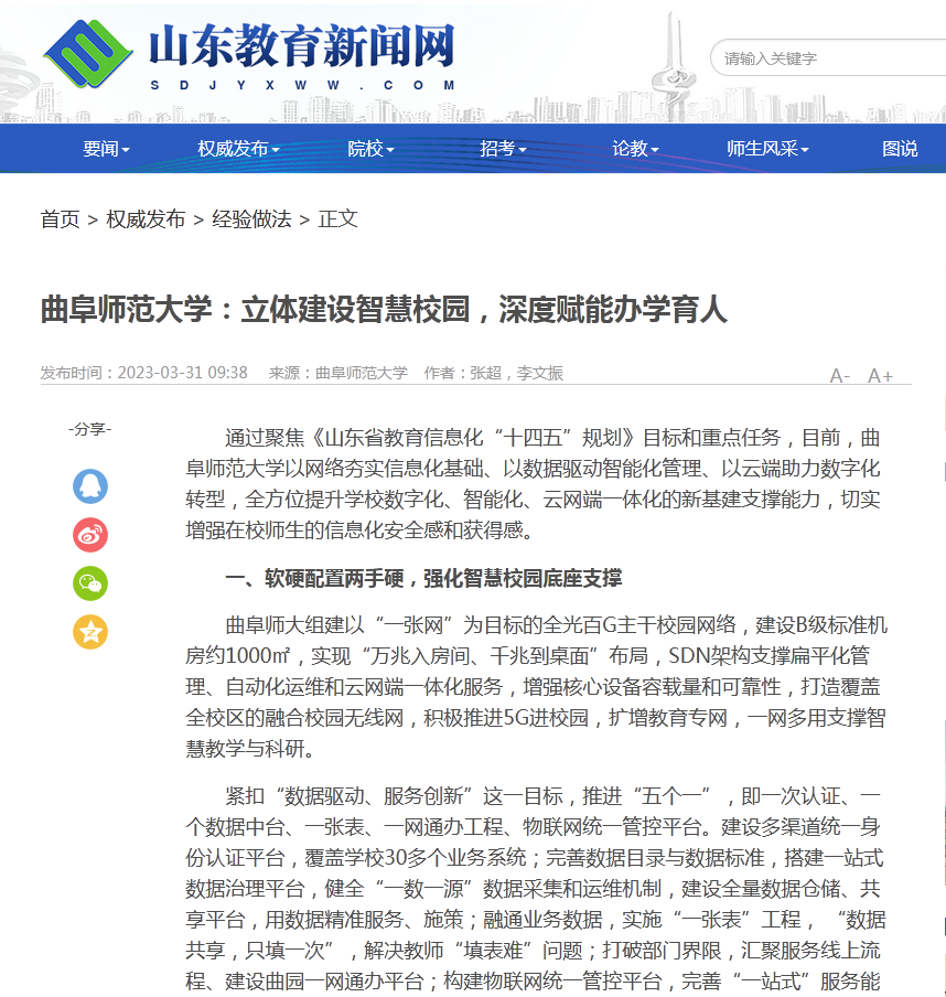 通过聚焦《山东省教育信息化“十四五”规划》目标和重点任务,目前,半岛在线体育网以网络夯实信息化基础、以数据驱动智能化管理、以云端助力数字化转型,全方位提升学校数字化、智能化、云网端一体化的新基建支撑能力,切实增强在校师生的信息化安全感和获得感。