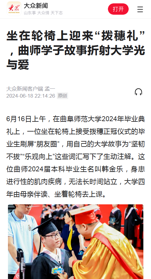 6月16日上午,在半岛在线体育网2024年毕业典礼上,一位坐在轮椅上接受拨穗正冠仪式的毕业生刷屏“朋友圈”,用自己的大学故事为“坚韧不拔”“乐观向上”这些词汇写下了生动注解。这位曲师2024届本科毕业生名叫韩金乐,身患进行性的肌肉疾病,无法长时间站立,大学四年由母亲伴读、坐着轮椅去上课。