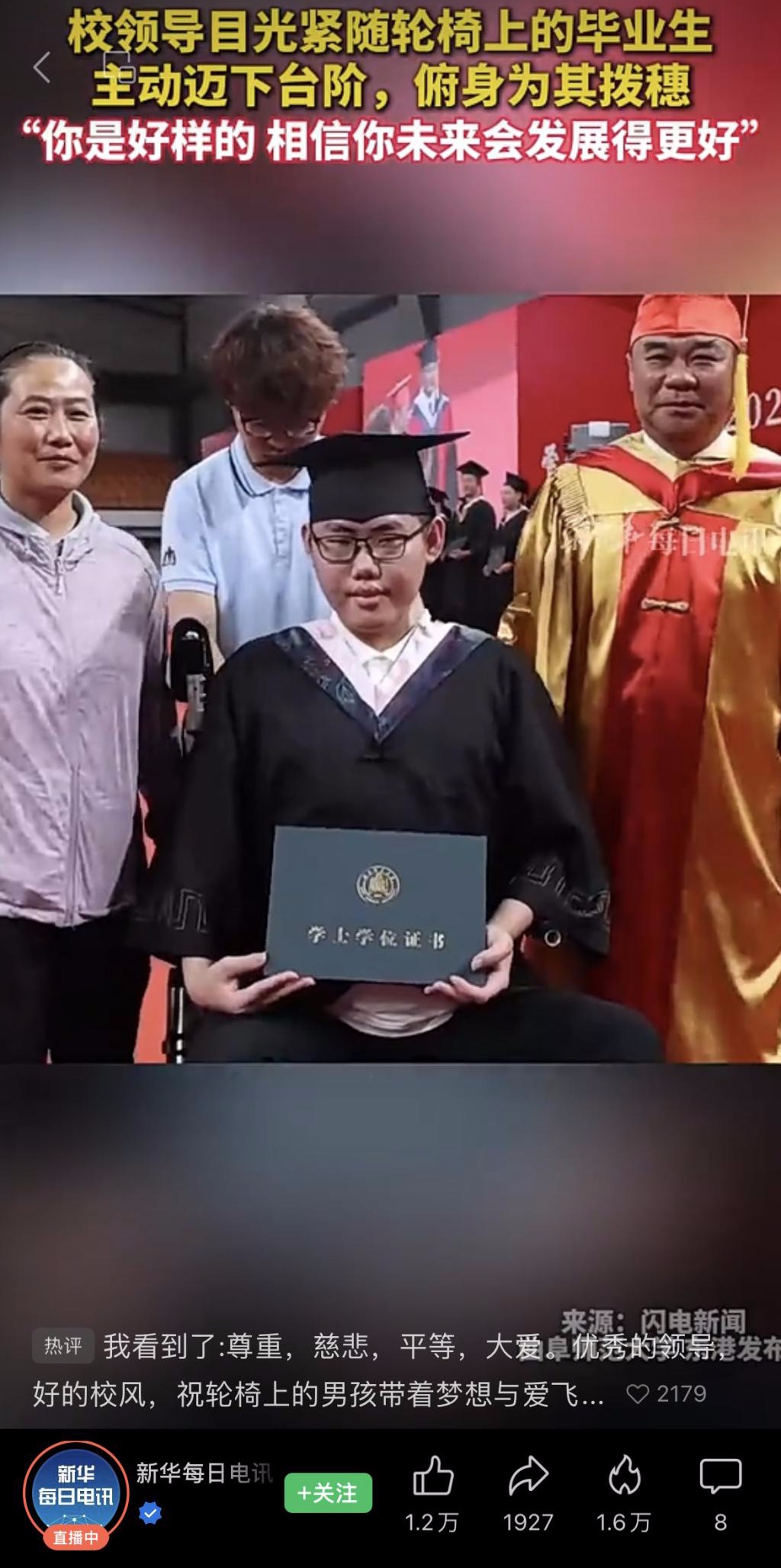 【新华每日电讯】党委书记邢光俯身为轮椅上的毕业生拨穗
