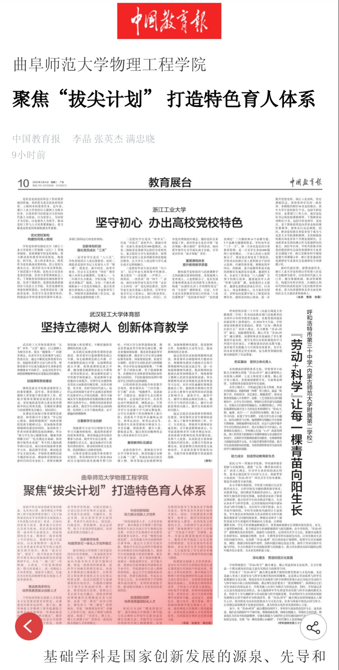 基础学科是国家创新发展的源泉、先导和后盾。半岛在线体育网物理工程学院按照教育部门《关于加快建设高水平本科教育全面提高人才培养能力的意见》要求,以面向国家重大需求、服务地方经济社会发展为使命,依托首批国家级别一流本科专业建设点、国家级别特色专业、物理学一级学科博士学位授权点、物理学博士后流动站、山东省物理学一流学科、山东省普通本科高等学校示范性基层教学组织,聚焦“拔尖计划”,建设了一批开展高水平前沿科学研究和应用基础研究的省级教研平台,并在“一制三化”(导师制、小班化、个性化和国际化)模式的基础上,进一步提高人才培养质量、创新育人模式,打造出具有特色的物理学拔尖创新人才培养新体系。