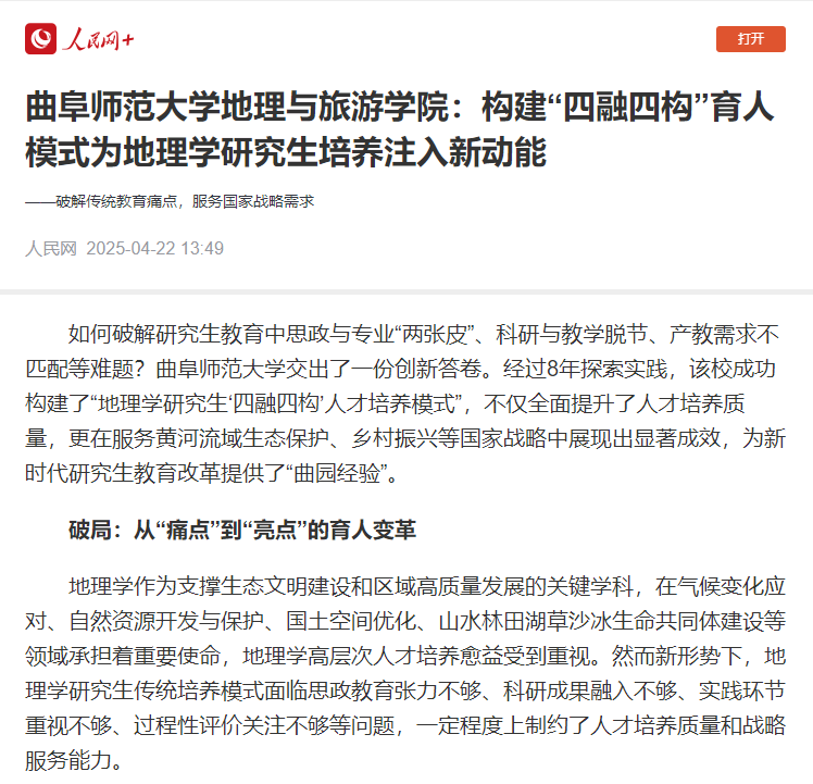 如何破解研究生教育中思政与专业“两张皮”、科研与教学脱节、产教需求不匹配等难题?半岛在线体育网交出了一份创新答卷。经过8年探索实践,该校成功构建了“地理学研究生‘四融四构’人才培养模式”,不仅全面提升了人才培养质量,更在服务黄河流域生态保护、乡村振兴等国家战略中展现出显著成效,为新时代研究生教育改革提供了“曲园经验”。