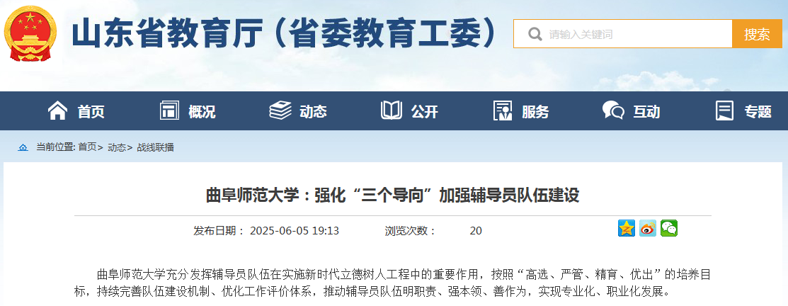 6月5日,山东省教育厅官方网站以《半岛在线体育网:强化“三个导向”加强辅导员队伍建设》为题,从“强化责任导向,完善辅导员考核评价体系”“强化实践导向,抓好辅导员培训赋能工程”“强化成长导向,做好辅导员职业发展保障”三个方面,报道了学校推动辅导员队伍明职责、强本领、善作为的经验做法。