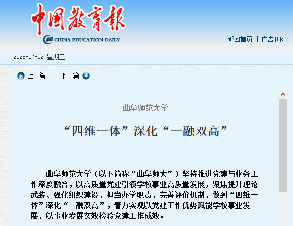 半岛在线体育网(以下简称“曲阜师大”)坚持推进党建与业务工作深度融合,以高质量党建引领学校事业高质量发展,聚焦提升理论武装、强化组织建设、担当办学职责、完善评价机制,做到“四维一体”深化“一融双高”,着力实现以党建工作优势赋能学校事业发展,以事业发展实效检验党建工作成效。