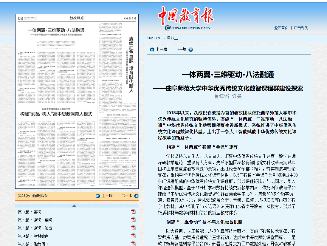 学校坚持以文化人、以文育人,汇聚中华优秀传统文化名家、教学名师深研教学理论、重设育人方案,先后承担国家教育部门新文科改革与实践项目和山东省重点教改课题10余项,出版论著30余部(篇),夯实制度与理论支撑。重构中华优秀传统文化课程体系,以5门数智“金课”为引领建成由30余门课程组成的中华优秀传统文化课程群,形成课程矩阵。与此同时,引入课程迭代模型,基于AI分析学习数据持续更新教学内容。依托网络教育平台建成“中华优秀传统文化数智课程群智慧教学中心”,集聚500多个数字资源,服务超9万人次。建成5部涵盖文字、音频、视频、虚拟现实等内容的数字化教材,其中《孔子与〈论语〉》获评山东省高等教育一流教材,形成了纸质教材与数字教材相结合的新型教材体系。 创建“三维驱动”技术与文化融合机制 以大数据、人工智能、虚拟仿真等技术赋能,实施“数智技术支撑、数智师资夯基、数智资源适配”三维驱动,达成技术深度赋能课堂目标。一是软件端与智慧树等平台合作,部署云超算支持百TB数据处理,开发AI教学系统;硬件端建成历史文化虚拟仿真实验中心和中华优秀传统文化智慧课程教研中心,配置百万级文化数据库。二是与东中西部高校建成5个师资跨域协同虚拟教研室,实现教案共研、课程共创、课堂共建和资源共享。三是依托智慧教育平台构建智能推荐多模态资源库,基于学情分析精准推送教学资源;自建的3个虚拟仿真平台,嫁接531个文化场景实验,学生实验满意度达96%。 打造“八法融通”全链式数智协同育人模式 课程群构建了“四策贯通+四域联动”的“八法融通”全链式数智协同育人模式,打通“设计—教学—实践—评价—协同”育人全环节,满足学生差异化学习需求,提升高阶能力培养水平。在教学方法上,推进“认知智能优化教学设计、智能技术驱动高阶学习、智慧平台赋能教学实践、智评机制贯穿教学评价”四策贯通。 课前基于学情生成N种个性化学案,AI辅助生成精准化教案,构建智慧预学系统;课中依托智慧学习平台和知识图谱实现知识精准传递,文化AI智能体和VR场景推动价值高阶转化;课外开发智慧实践专区,设置文化传播、美德践行、项目赛事三个板块,全面提升学生文化素养与实践能力;智评机制基于180万条学习交互数据,以数据驱动、评价驱动、系统自驱动实现精准画像、精准诊断、精准干预。在优资协同上,实行“校际云联、社区辐射、政企合作、国际交流”四域联动,构建教育共同体。以云联课堂和虚拟教研室实现东中西部35所院校共建,实现教案共研、课程共创、课堂共建和资源共享;以强大课程资源辐射200余村社,累计服务5万余人,获评省级社区教育优秀课程资源;联合42家企事业单位共建研学、实习、就业基地,与曲阜文化示范区、济宁政德教育干部学院共建共享课程;依托“华文教育基地”开展中外文化交流活动,学校国际学院采用英语版虚拟仿真实验课程教学。 数智课程群建设成效显著,示范引领作用凸显 中华优秀传统文化课程群建设在信息技术和育人范式上实现了新突破。首先,在技术方面实现了文化与数智深度融合。文技融合产生了以下三个明显效果:知识生动化,开发中华优秀传统文化NLP系统,内化百万文化语料,精准具象传递知识;认知拟人化,打造文化交互智能体,具备类人思维和语义生成能力,支持典籍解读与思辨对话;价值显性化,以AI动态关联前沿资讯,激活中华优秀传统文化时代生命力,融合真善美相关元素,赋能课程思政。其次,创新中华优秀传统文化育人范式,探索了“价值引领·技术融合·三全育人”新文科建设路径。课程教学立足立德树人根本使命,实现中华优秀传统文化教育效能的高阶跃升:以价值为魂,确保技术赋能始终服务于文化传承;以融合为要,实现数智技术与文化育人在“目标、内容、方法、实践、评价、协同”方面的全面融合;以育人为本,构建跨校际、跨地域、跨领域的“三全育人”网络,形成多元主体共创的文化教育共同体。该路径有效促进了优质资源共享与复合型文化人才协同培养,推动了中华优秀传统文化的创造性转化与创新性发展。 经过7年实践,中华优秀传统文化数智课程群育人成效显著。课程覆盖全国230所高校,累计教授9.6万余名学生,教学互动量达180万次,学生获省级以上奖励110余项,涌现出先进典型200余人。教学团队建设卓有成效,已建成“国家人才领军—省级专家支撑—青年骨干接力”的跨学科师资梯队,5人获儒学研究领域“泰山学者”称号,1人获评省级教学名师,2人获评山东省智库高端人才。课程建设成效明显,入选国家一流课程3门、省级一流课程5门、全国高校“慕课十年典型案例”。课程群的示范效应广泛显现,被多家主流媒体报道30余次,课程群建设模式被35所高校采用,构建了覆盖东中西部的高校中华优秀传统文化育人网络。 半岛在线体育网中华优秀传统文化数智课程群建设,以立德树人为根本任务,以课程体系重构、技术赋能、教法革新、优资协同四大核心要素为支撑,实现了数智条件下文化精准传承、课堂效能跃升、优资协同共享,为数智时代人文课程建设提供了参考经验。 |