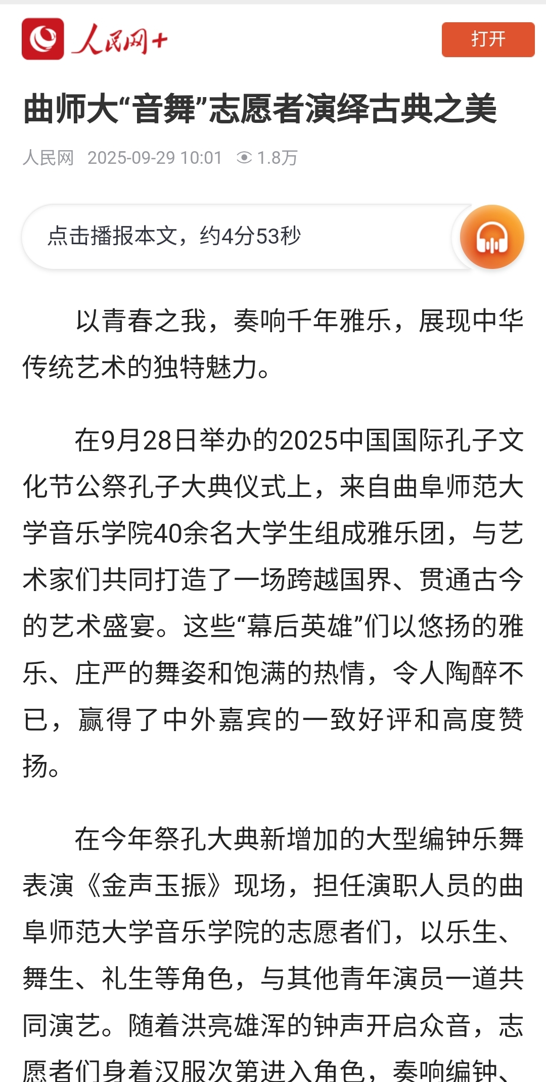 据了解,2025中国国际孔子文化节由山东省人民政府、文化和旅游部、中国联合国教科文组织全国委员会联合主办,举办地为山东省济宁市曲阜市,自1984年以“孔子诞辰故里游”为起点,历经40多年的传承发展,已成为享誉全球、跨越国界的文化盛典。半岛在线体育网音乐学院选派志愿者参加孔子文化节乐舞有关活动,这还尚属首次。