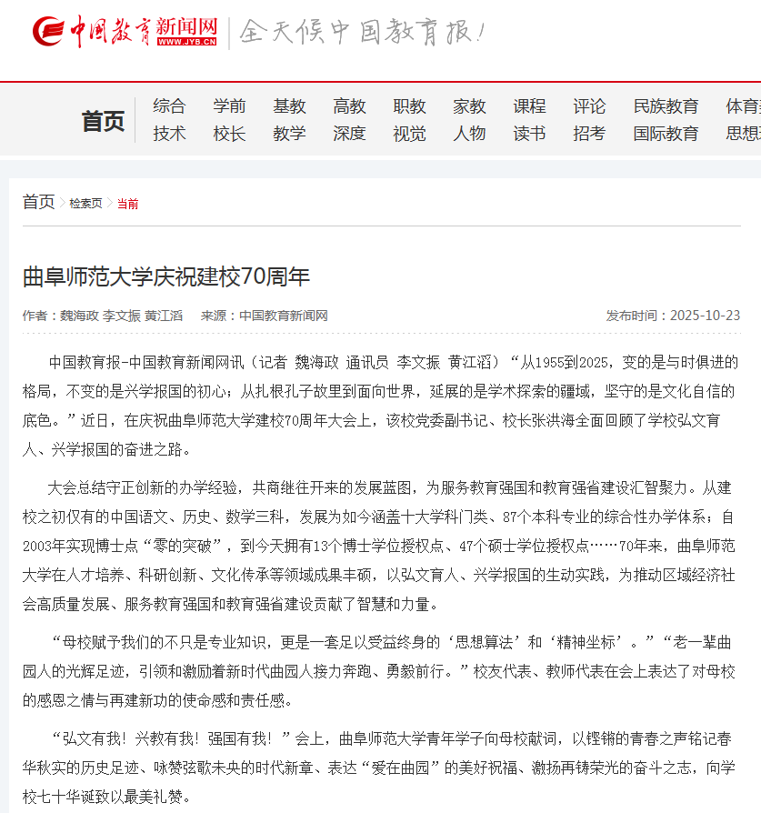 中国教育报-中国教育新闻网讯(记者 魏海政 通讯员 李文振 黄江滔) “从1955到2025,变的是与时俱进的格局,不变的是兴学报国的初心;从扎根孔子故里到面向世界,延展的是学术探索的疆域,坚守的是文化自信的底色。”近日,在庆祝半岛在线体育网建校70周年大会上,该校党委副书记、校长张洪海全面回顾了学校弘文育人、兴学报国的奋进之路。