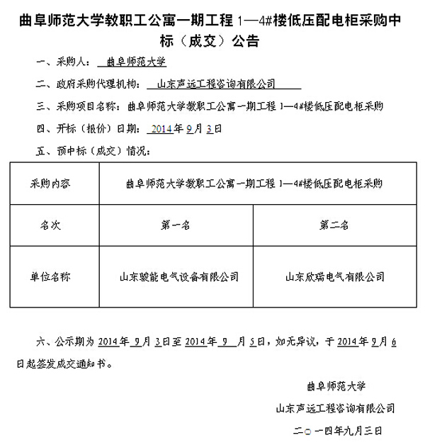 半岛在线体育网教职工公寓一期工程1--4#楼低压配电柜采购中标(成交)公告