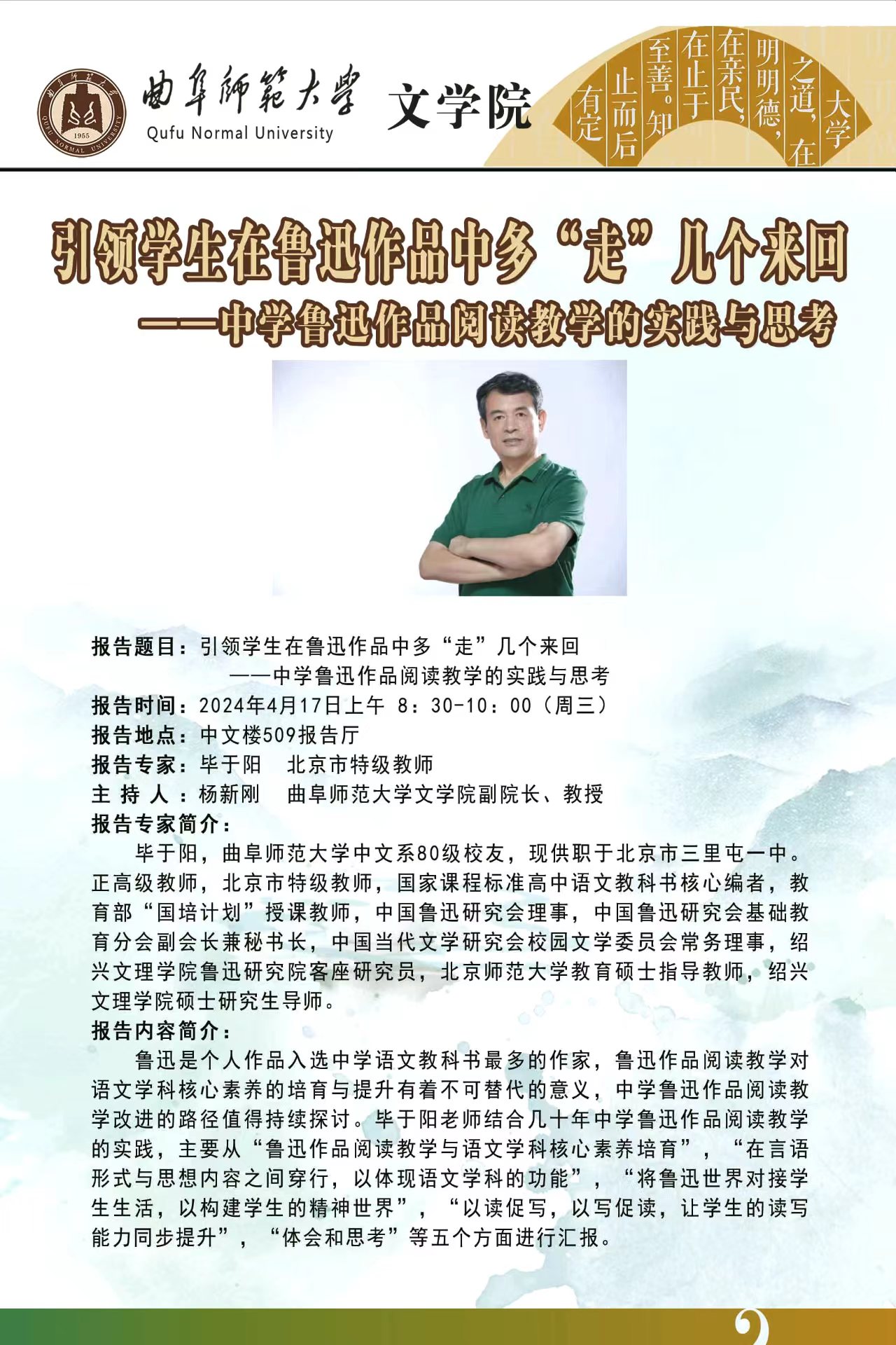 文学院学术报告预告:引领学生在鲁迅作品中多“走”几个来回——中学鲁迅作品阅读教学的实践与思考