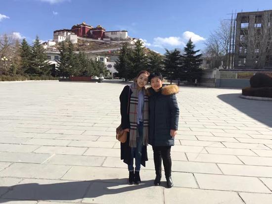 2017年1月,09届宏志生诺吉·曲拥措姆(左一)去拉萨中学看望吕淑霞。曲拥措姆现为哈尔滨工业大学在职博士,在共青团中央统战部民族宗教处挂职。受访者供图