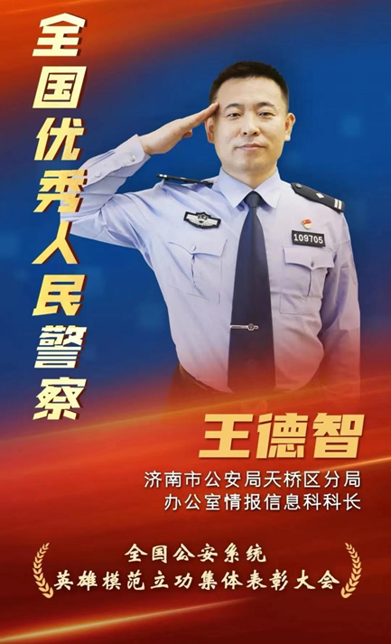王德智,现为济南市公安局天桥区分局办公室情报信息科科长。王德智通过选调投身到警营,毅然选择了最艰苦的刑警岗位,用担当奉献扛起岗位职责,用知识专长助力警察事业,把忠诚与正义烙刻入警魂。先后荣获“全省优秀人民警察”、“齐鲁标兵人才”、全省首批“警务知识工程师”、泉城最美选调生等多项荣誉,并荣立个人二等功。