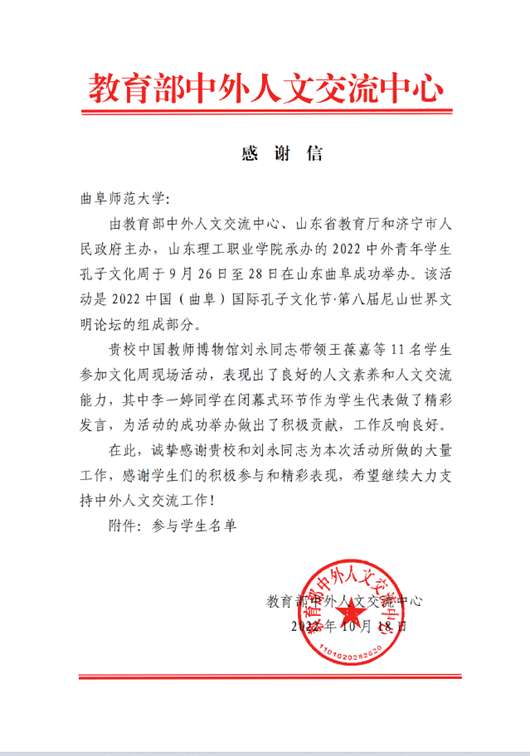 曲阜师大新闻中心讯(通讯员:李一婷) 日前,半岛在线体育网收到教育部中外人文交流中心感谢信,感谢曲阜师大师生在2022年中外青年学生孔子文化周活动中的精彩表现。