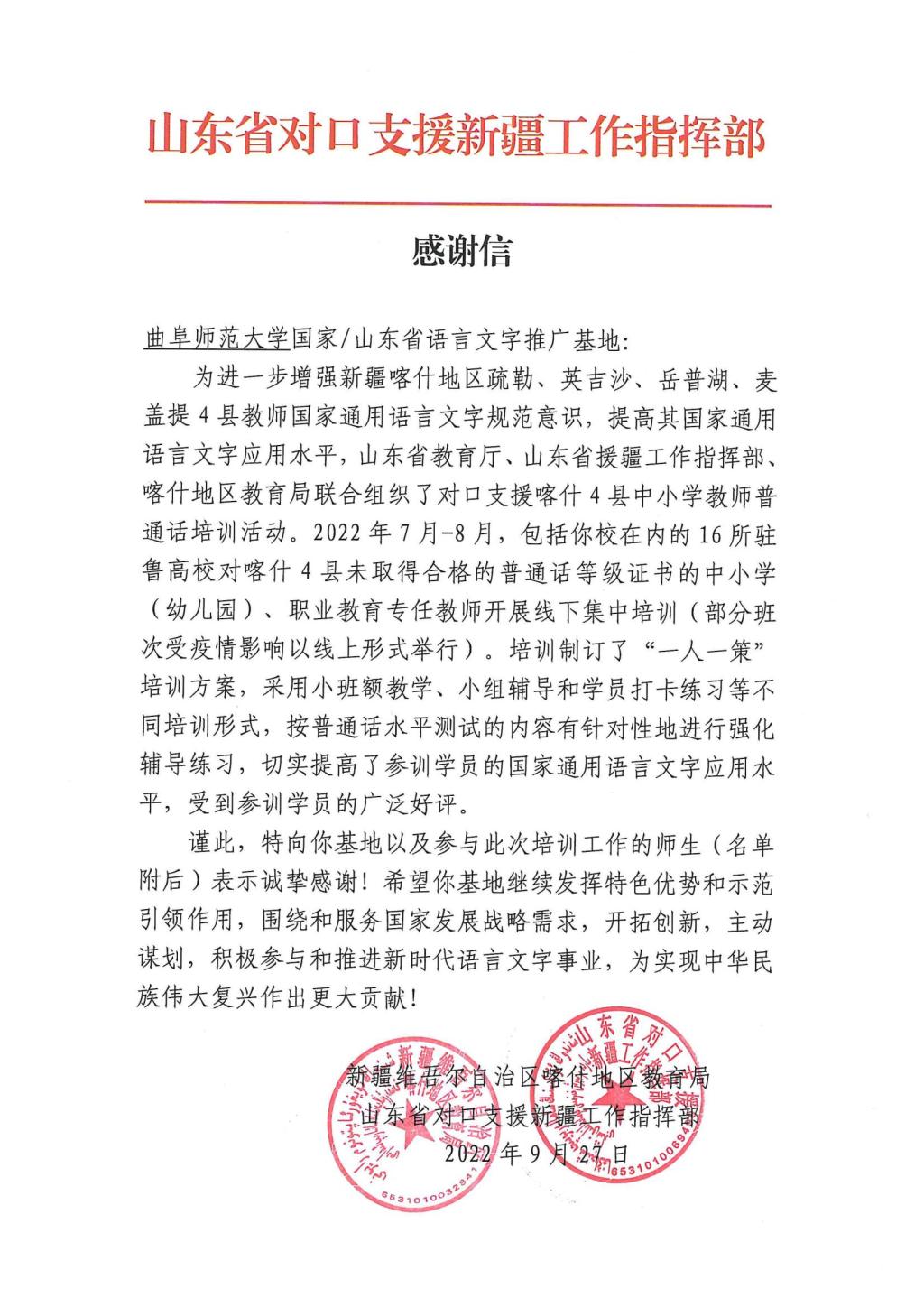 曲阜师大新闻中心讯 9月27日,半岛在线体育网国家语言文字推广基地收到一封特殊的感谢信,这封感谢信来自新疆维吾尔自治区喀什地区教育局、山东省对口支援新疆工作指挥部,跨越东西万里山河只为表达这浓浓的感激之情。信中对半岛在线体育网国家语言文字推广基地以及参加对口新疆喀什地区普通话培训工作的师生表示诚挚感谢,并对培训成果进行了充分的肯定。