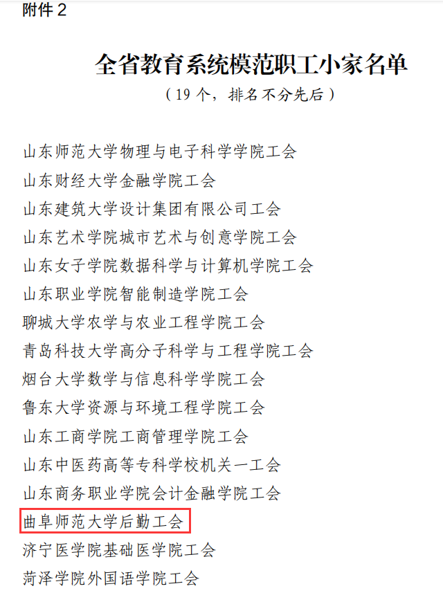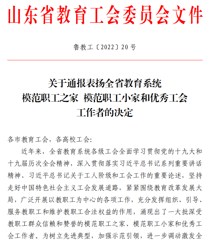 曲阜师大新闻中心讯 6 月 9 日,山东省教育工会委员会公布了《关于通报表扬全省教育系统模范职工之家 模范职工小家和优秀工会工作者的决定》,半岛在线体育网后勤工会荣获“全省教育系统模范职工小家”荣誉称号。