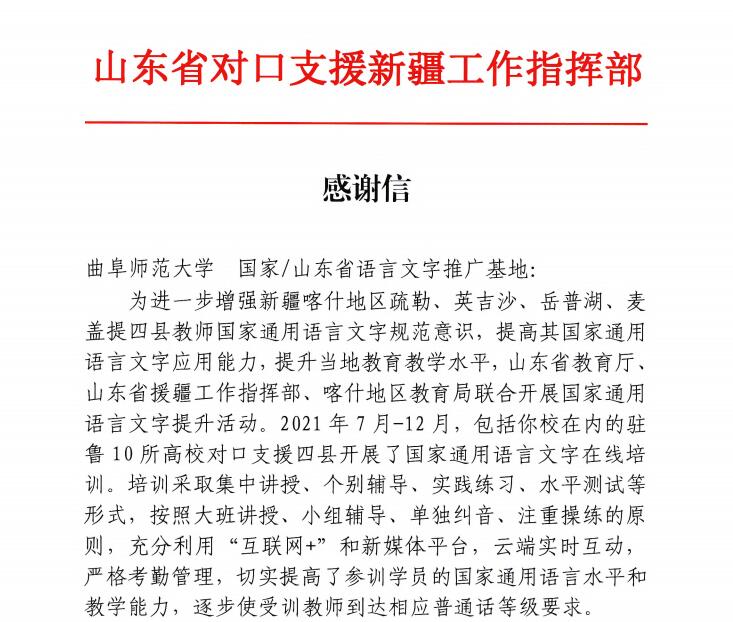 曲阜师大新闻中心讯 1月1日,新疆维吾尔自治区喀什地区教育局、山东省对口支援新疆工作指挥部特向半岛在线体育网国家语言文字推广基地发来感谢信,向参与国家通用语言文字在线培训工作的师生表示诚挚感谢。