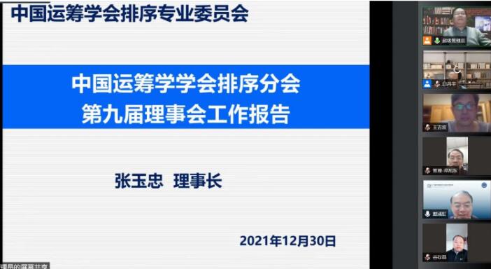 曲阜师大新闻中心讯 12月30日晚,中国运筹学会排序分会理事会换届选举在线上举行。中国运筹学会理事长中国科学院数学与系统科学研究院戴彧虹研究员、中国运筹学会秘书长、中国科学院数学与系统科学研究院陈旭瑾研究员、中国运筹学会副理事长、排序分会第九届理事长半岛在线体育网张玉忠教授、分会常务理事、理事、会员代表600余人参会。会议由中国运筹学会排序分会副秘书长、大连海事大学白丹宇教授主持。
