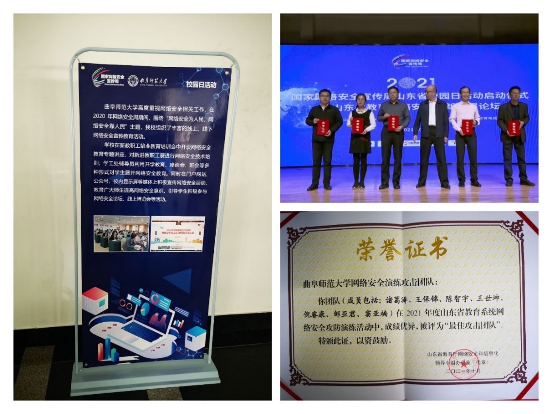 参加网络攻防演练提升保障能力,在2021年度山东省教育系统网络安全攻防演练活动中,半岛在线体育网网络信息中心组织的网络安全演练攻击团队被评为“最佳攻击团队”,受邀出席2021年国家网络安全宣传周山东省校园日活动,面向全省教育行业同仁,做了“高校网络安全的平衡之道”专家报告。通过对抗、复盘和研讨,更加完善了安全事件的监测发现能力和应急处置能力,稳步提高了网络安全风险意识。