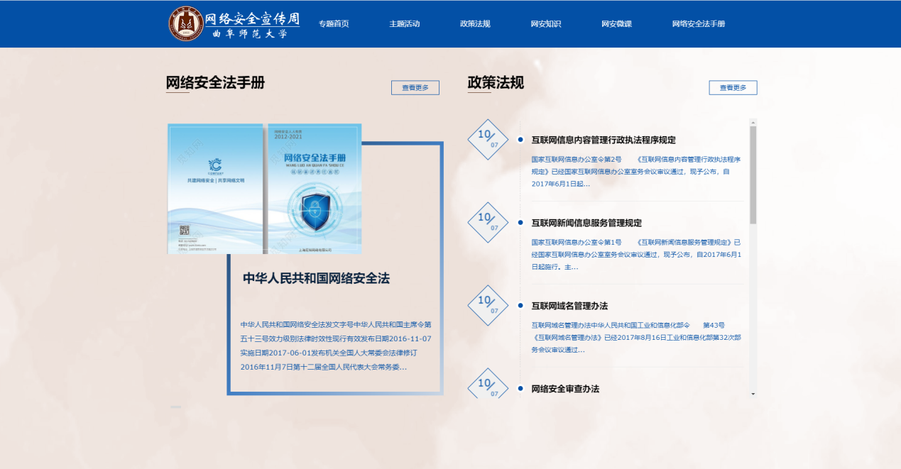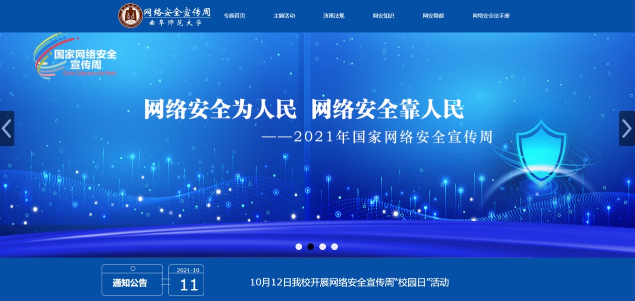 筹划并上线半岛在线体育网2021国家网络安全宣传周专题网站(https://wlaqxcz.qfnu.edu.cn/),普及《网络安全法》和《数据安全法》等法律法规及政策文件,扎实推进国家网络安全宣传工作。