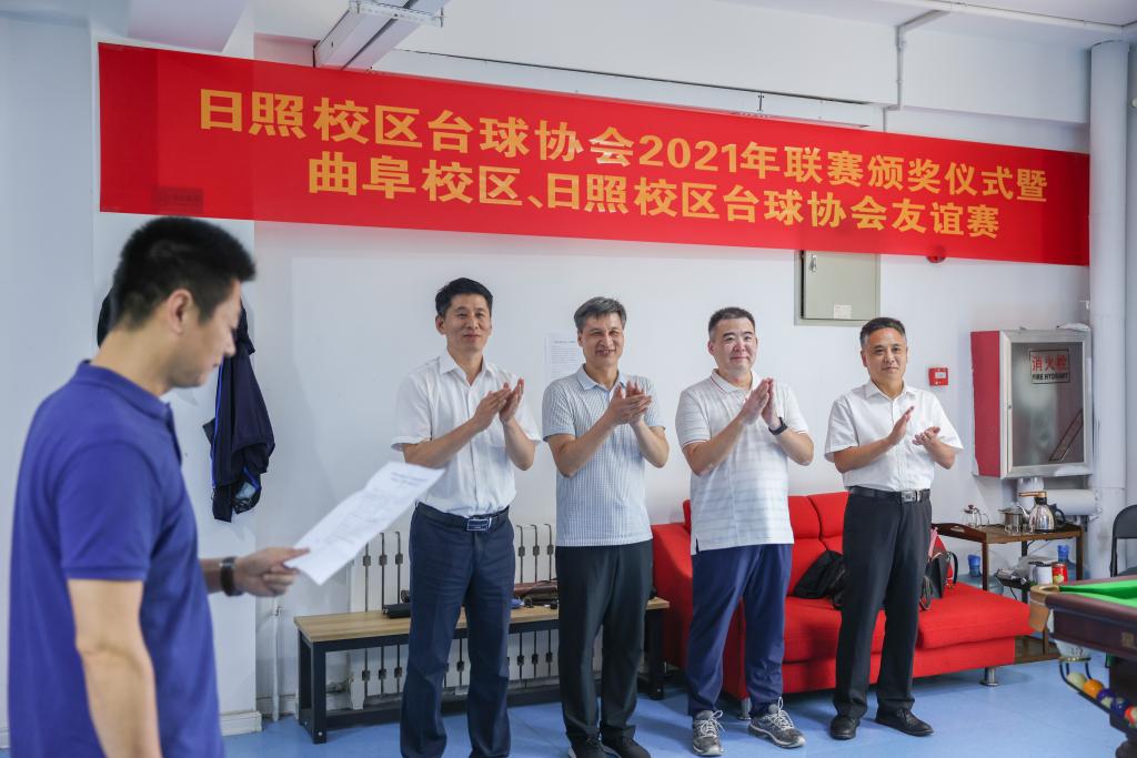 曲阜师大新闻中心讯(通讯员:姜振栋)为了庆祝建党100周年,进一步丰富广大教职工的业余文化生活,增强两校区教师之间的文体活动交流, 7月16日,由日照校区台球协会主办的台球联赛颁奖仪式暨曲阜校区、日照校区台球友谊赛顺利举行。校工会王万民、日照校区党委书记孔令军、日照校区办公室副主任崔波、日照校区台球协会会长李金雷,出席联赛颁奖仪式。仪式由日照校区台球协会秘书长姜振栋主持。