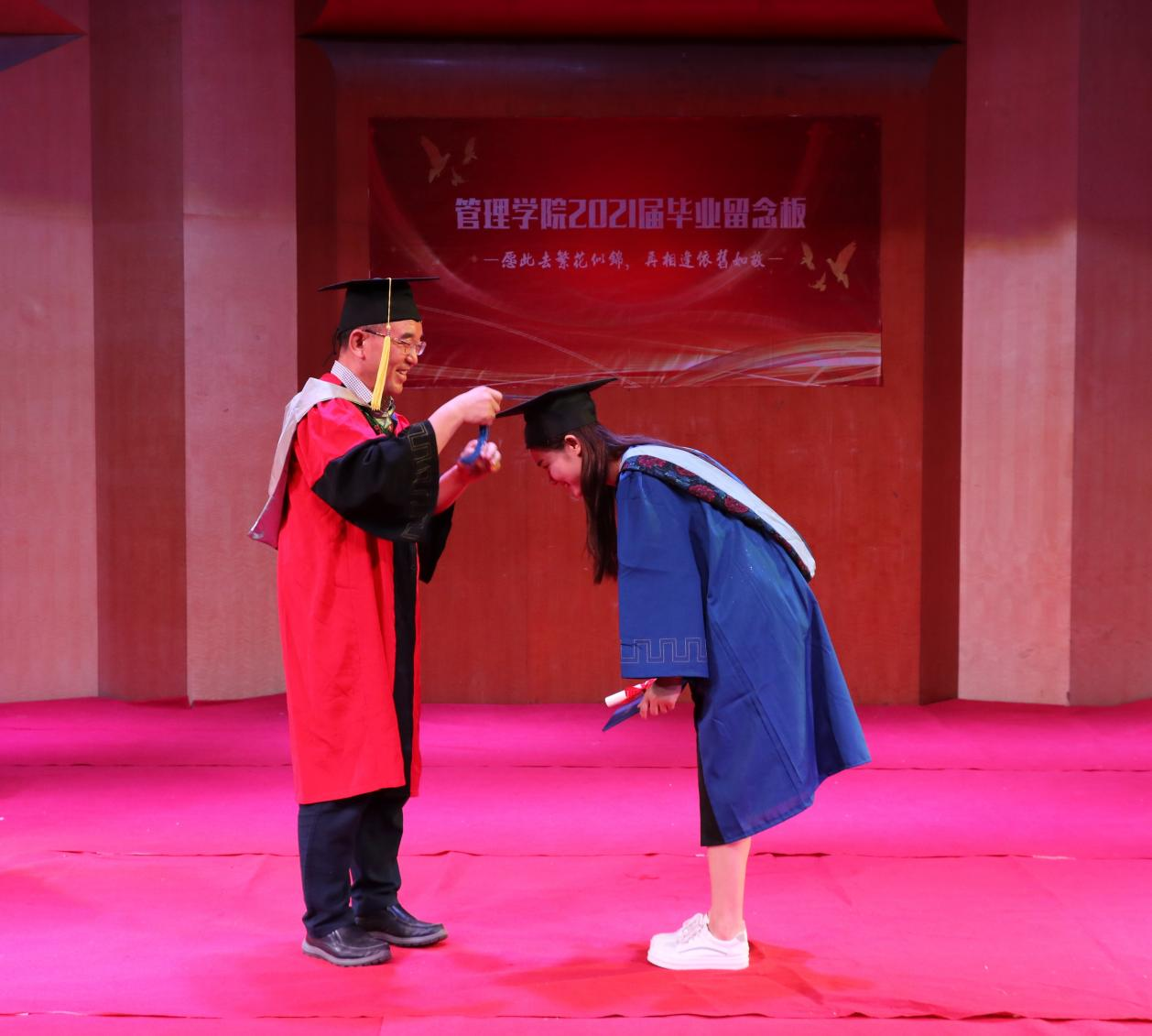 学院为毕业生特别制作了毕业视频,视频中记录了2021届毕业生自入校以来的生活点滴,看着视频中熟悉的照片,毕业生们相视一笑,眼眶微润。随后,刘进为2021届班级联络员颁发聘书,王宜举为2021届毕业生授予学位证书,拨穗正冠。管理学院279名本科生、14名硕士研究生完成毕业仪式。典礼最后,孙旭春向毕业生送上了临行前的嘱托和祝愿,典礼在《明天会更好》的音乐声中结束。