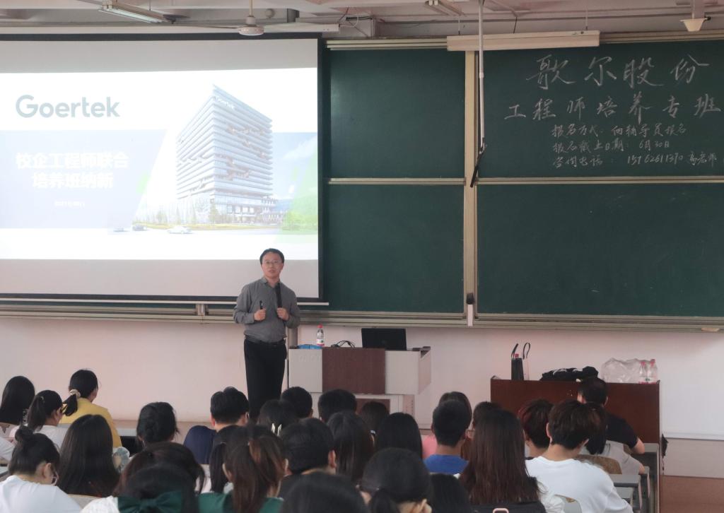 洽谈会前,歌尔股份有限公司还举行了和学生的座谈交流,对学生所关心的问题进行了详细解答。魏文滨亲自在曲阜师大工学院校企工程师联合培养班上进行宣讲纳新。下一步工学院将会依照学校要求和洽谈会商定事宜,完善制度、制定政策、出台举措,使校企合作项目在工学院落地落实。