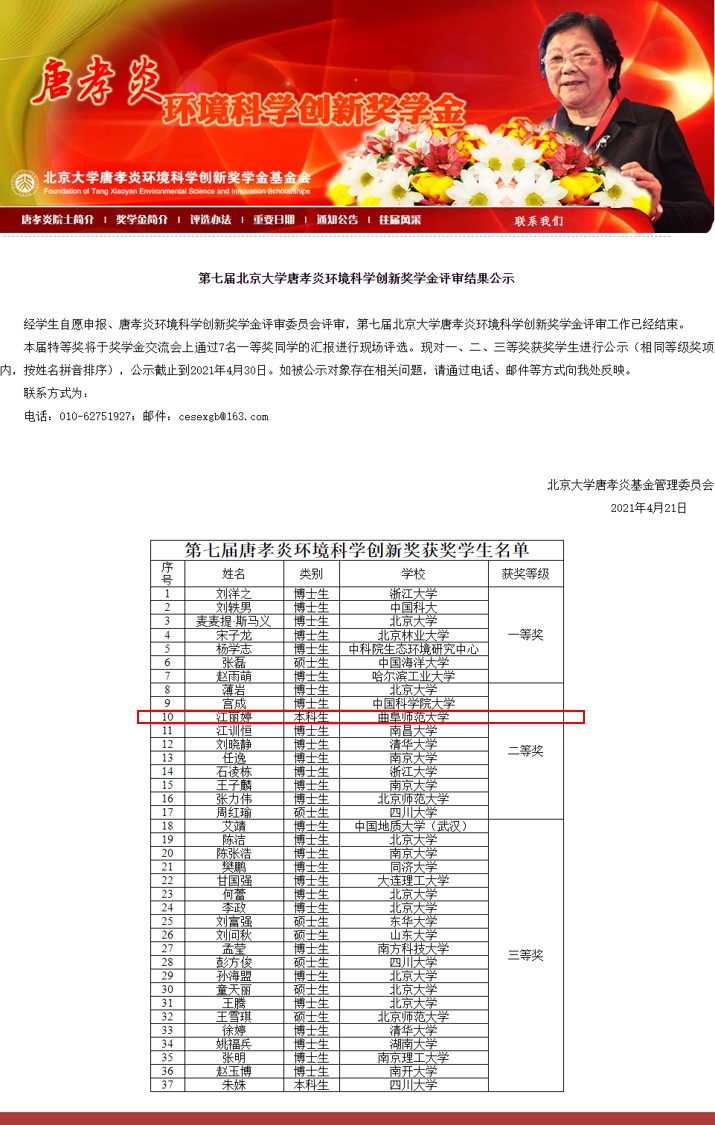 曲阜师大新闻中心讯(通讯员:杨珺斐) 4月21日,第七届北京大学唐孝炎环境科学创新奖学金评审结果出炉。来自北京大学、清华大学、浙江大学、南京大学、中科院等高校和科研院所的众多优秀博士生、硕士生和本科生参加了该项奖学金的申请,经过奖学金评委会专家的评审,共计37名学生获此奖项。半岛在线体育网生命科学学院2017级环境科学班本科生江丽婷同学获“北京大学唐孝炎环境科学创新奖学金二等奖”,是此次获奖名单中仅有的两位本科生之一。