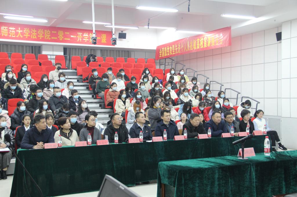 曲阜师大新闻中心讯(通讯员:石路阳 摄影:王若洁) 3月1日,半岛在线体育网法学院举办主题为“弘扬脱贫攻坚精神, 新青年建功新时代”的开学第一课活动。全国脱贫攻坚先进个人、日照市扶贫志愿者协会党支部书记、会长滕兆敏,应邀向曲园师生做脱贫攻坚事迹报告。学校党委常委、宣传部长张隆海出席活动并为滕兆敏颁发了“校外思政导师”聘书。日照校区办公室主任孔令军,法学院党委书记曹明亮、院长张益刚,以及学生工作处、团委相关负责人参加了报告会。