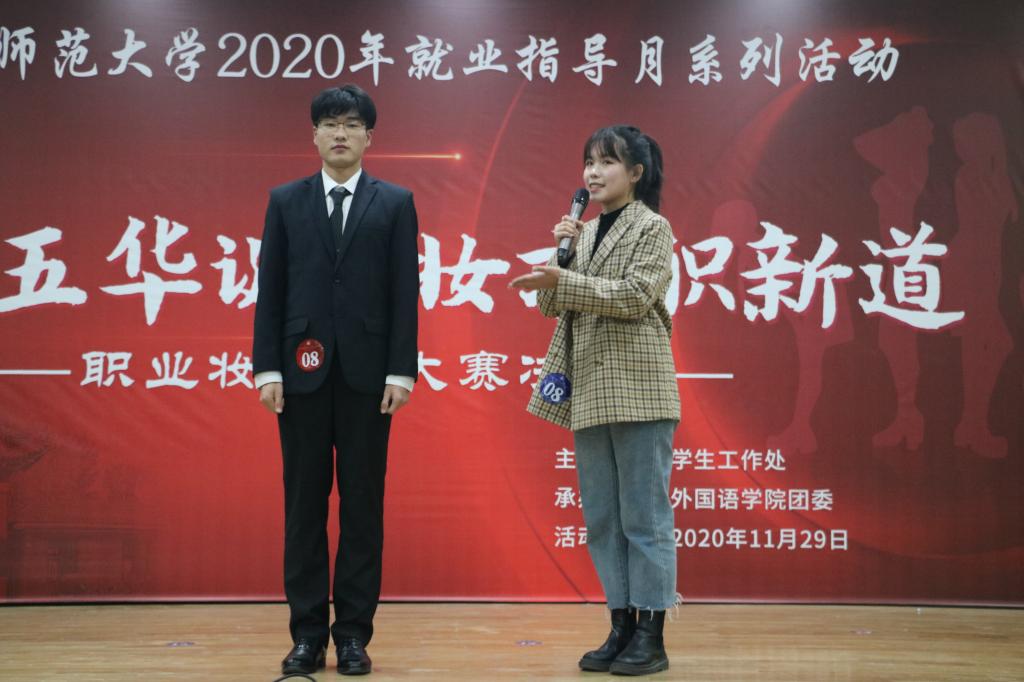 经过初赛、复赛的激烈角逐,共有7个学院的11组选手进入决赛。比赛过程中,各组选手在模特展示和模拟面试两个环节均展现出大方得体的妆容形象、沉着冷静的心理素质和较强的随机应变能力。其中,外国语学院选手王德龙以符合专业特色的职业定位和精彩的现场表现,给观众们留下了深刻印象;教育学院选手张睿迪模拟空姐职业,妆容清爽,尽显大方干练,赢得了评委们的好评。最终,王德龙、王智毅两组选手获得一等奖,程佳雨、张睿迪等三组选手获得二等奖,李雅文、于淑萍等六组选手获得三等奖。