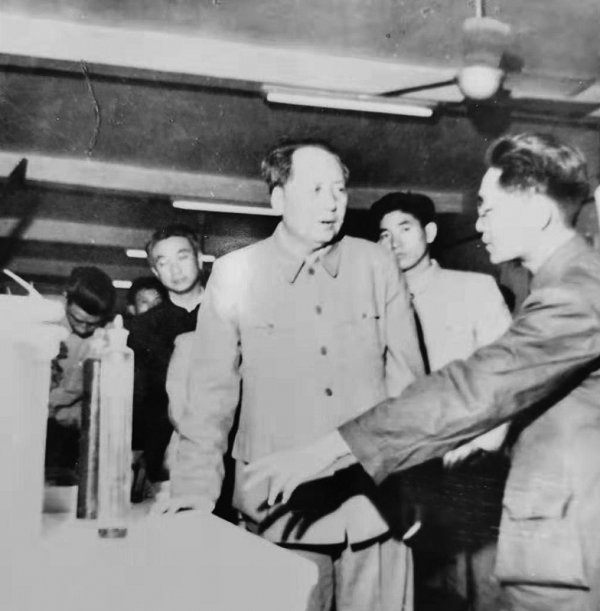 上边的照片是毛主席在山东省委书记舒同同志和有关人员陪同下观看 “土蒸馏釜”。