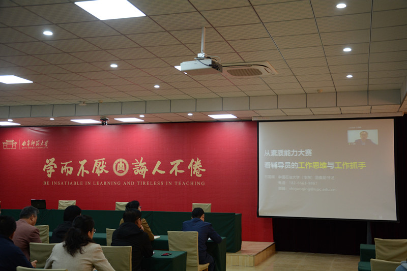 曲阜师大新闻中心讯(通讯员:刘翔)为进一步加强辅导员队伍建设,全面提升辅导员素质能力和工作水平,10月23日,我校举办辅导员培训班第三讲,中国石油大学(华东)团委副书记石国卿通过视频会议的方式作了题为《高校辅导员的工作思维与抓手》报告。各学院党委副书记、全体本科生辅导员、研究生辅导员、学工处、研究生处、团委相关负责同志分别在曲阜校区弘道厅和日照校区图书馆报告厅参加了培训。培训由校团委书记宋国栋主持。
