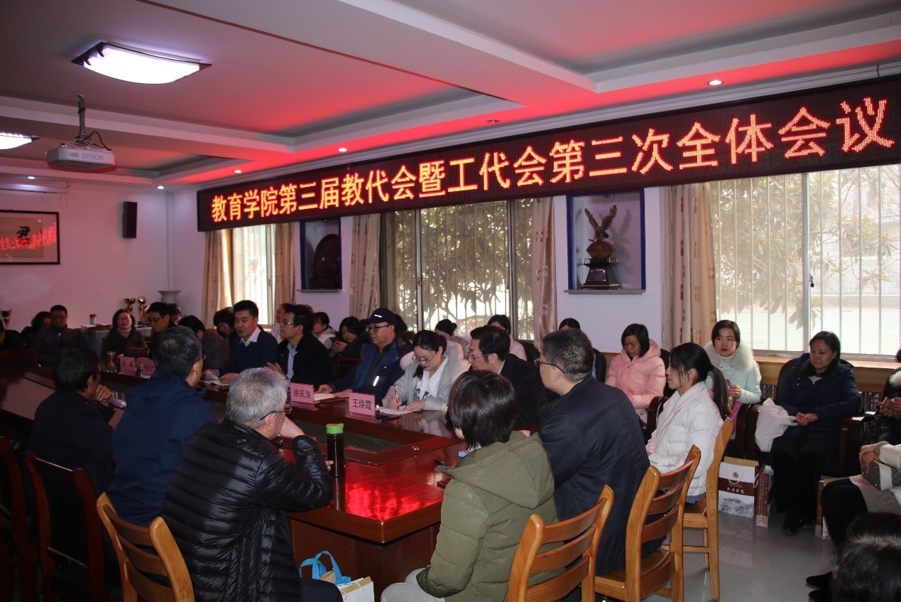 2020年1月10日下午,曲阜师大教育学院第三届教代会暨工代会第三次全体会议顺利召开,学院全体教职工参加会议。院长唐爱民作学院工作报告,工会主席王焕霞作工会工作报告,学院党委书记孙俊华主持会议。