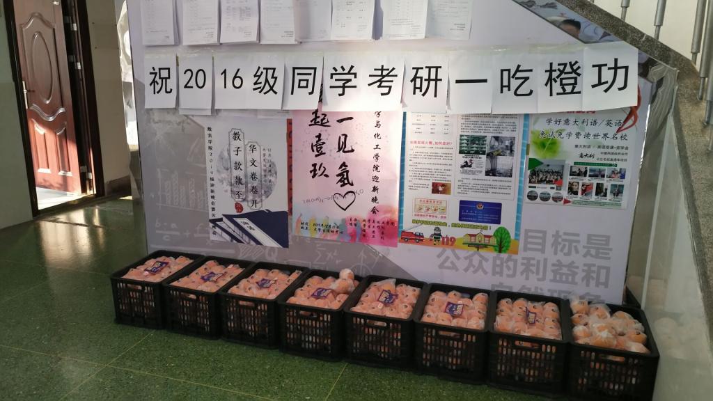 12月19日早上,在数学科学学院党委副书记曲凤东的带领下,辅导员老师们为2016级考研学生发放新鲜的橙子,预祝考研学子心想事“橙”,一吃“橙”功。