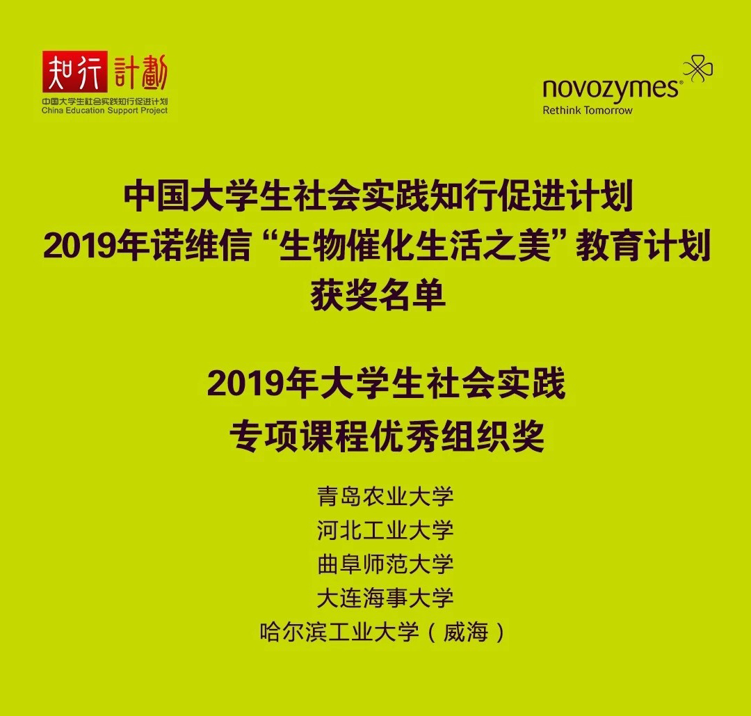 2019年我校组建3支校级社会实践队伍参与“知行计划”诺维信“生物催化生活之美”教育项目,在日照市、菏泽市开展科普活动,旨在帮助4290名中小学生了解生物科学知识。近日,该活动荣获2019年“知行计划”大学生社会实践专项课程优秀组织奖。