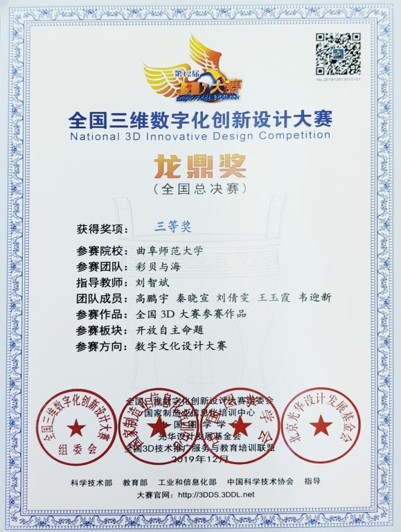近日,我校信息科学与工程学院刘智斌老师指导的参赛队伍--彩贝与海参赛团队在全国三维数字化创新设计大赛中斩获龙鼎奖三等奖,这是我校首次在全国三维数字化创新设计大赛中获此殊荣。全国三维数字化创新设计大赛(简称“全国3D大赛”或3DDS)由全国三维数字化技术推广服务与教育培训联盟(3D动力)发起举办,并得到国家科技部、教育部、工信部、中国科协等部门指导,联合国家制造业信息化培训中心、中国图学学会、光华设计发展基金会等单位共同主办,是在国家大力实施创新驱动发展战略、推动实体经济和数字经济融合发展的时代背景下开展的一项大型公益赛事,以“三维数字化”与“创新设计”为特色,突出体现科技进步和产业升级的要求,是大众创新、万众创业的具体实践。