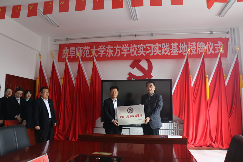 近日,外国语学院实习实践基地授牌仪式于曲阜东方学校成功举行。外国语学院党委书记费沂涛、党委副书记王作茂、团委书记王旖旎、英语系副主任邢加新,曲阜东方学校校长王延志、副校长康杰出席授牌仪式。